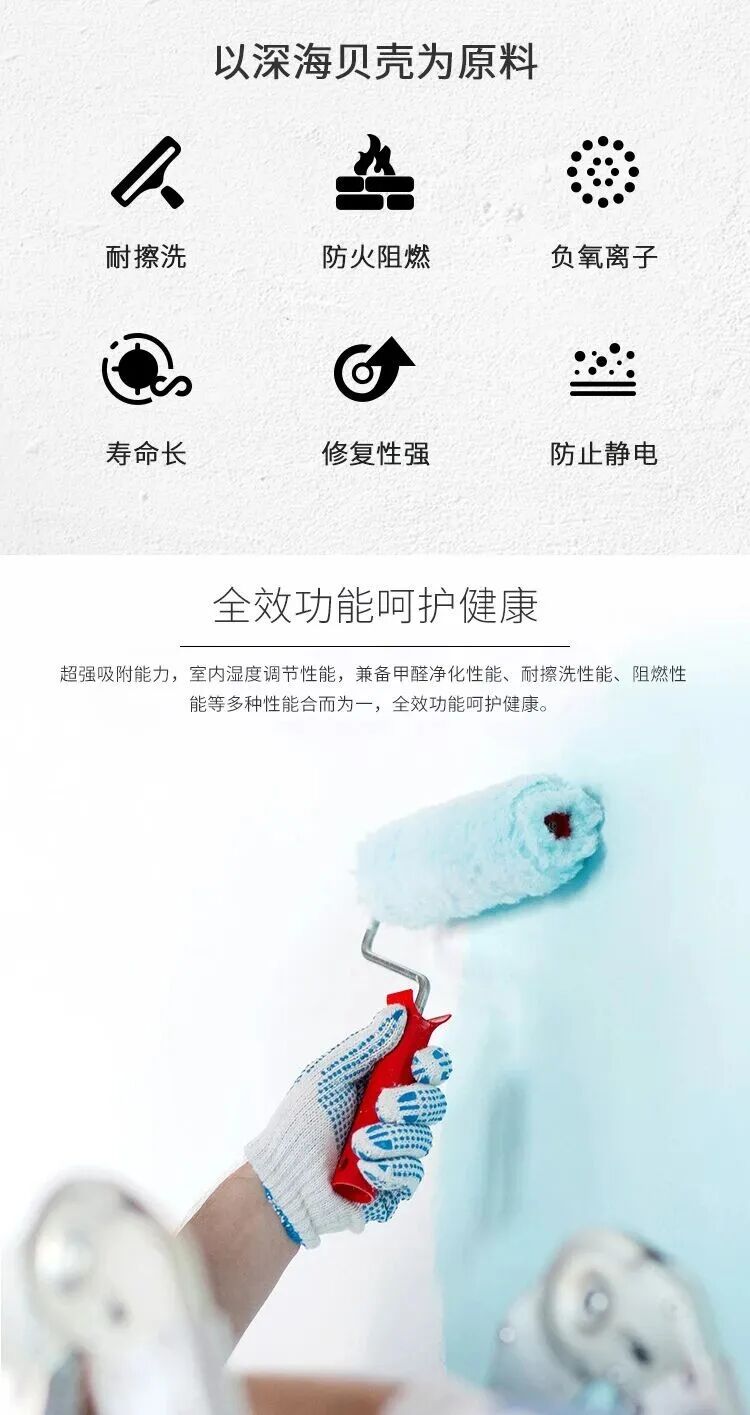 •安全防火隔音:贝壳粉成分天然阻燃,遇火不燃烧且无有毒烟雾;其多孔结构还能吸收声波,降低噪音污染,为家人创造静谧、安心的居住环境。